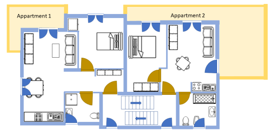 Auf der ersten und zweitem Etage befinden sich jeweils 2 Appartments.